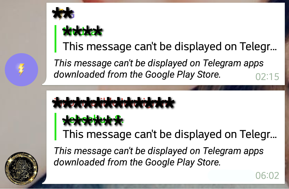 "This message can't be displayed on Telegram apps downloaded from the Google Play Store."