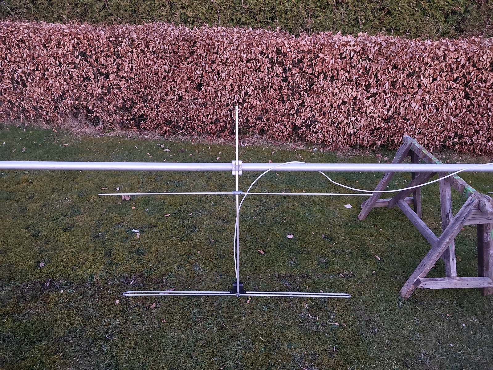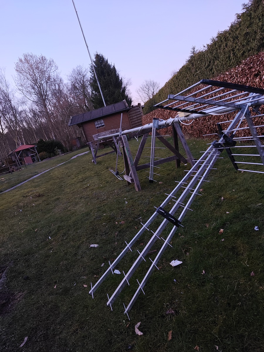 Der Umbau der ehemaligen drei Elemente Antenne sieht auch gut aus, die Abmessungen werden annähernd gut sein, es wäre sogar möglich gewesen nur den Reflektor zu entfernen und die anderen Elemente dort zu belassen, weil der Mast schon der Reflektor ist.