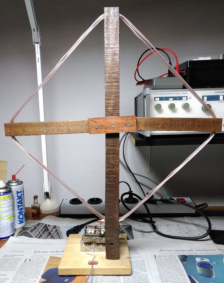 Die "Spitzen" des Quadrats sind 40cm auseinander (Kantenlänge ca. 29cm) und es sind zwei Windungen gewickelt. In meinem Fall sind 4 Leiter parallelgeschaltet, um die Güte der Spule zu maximieren.